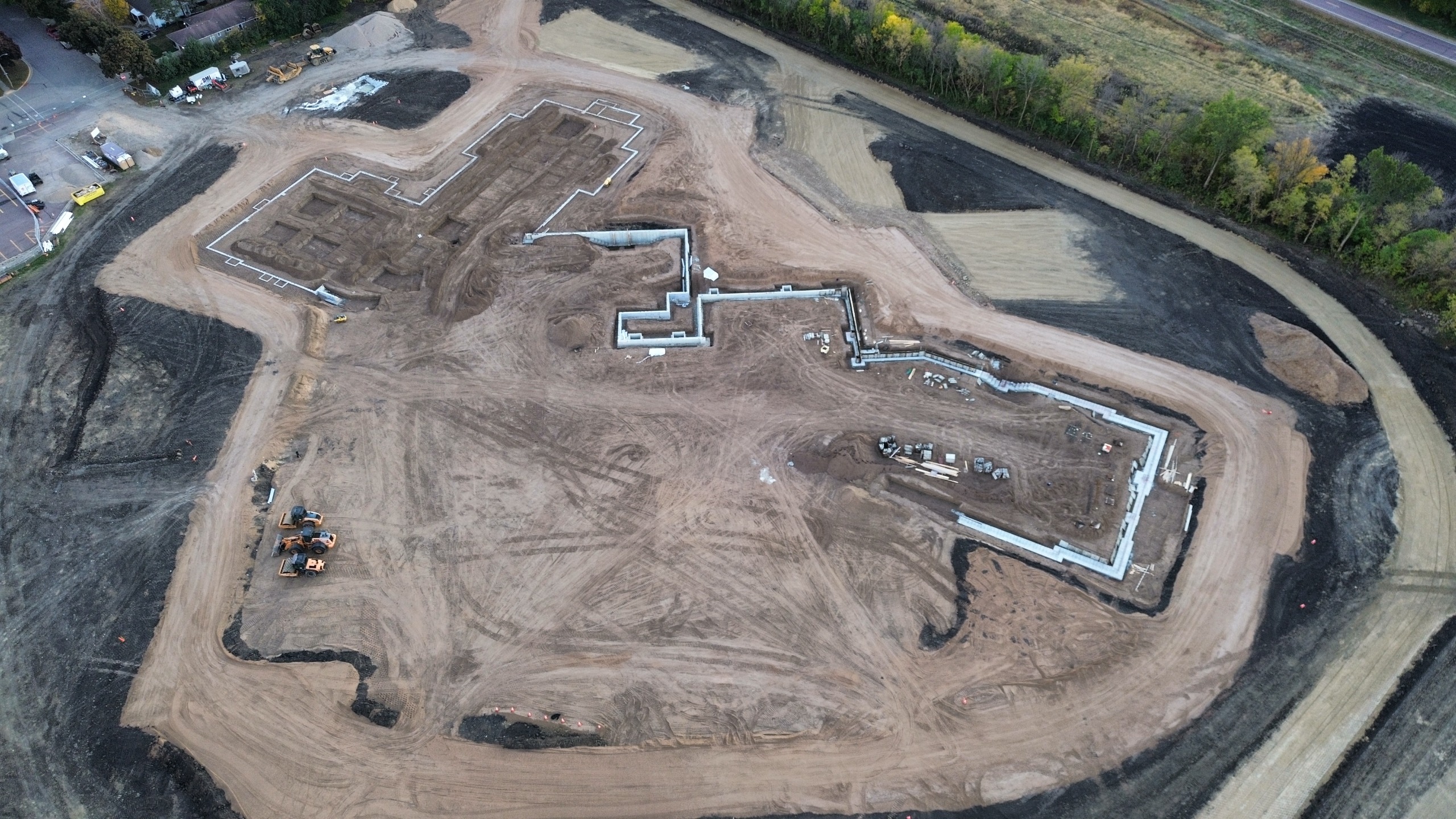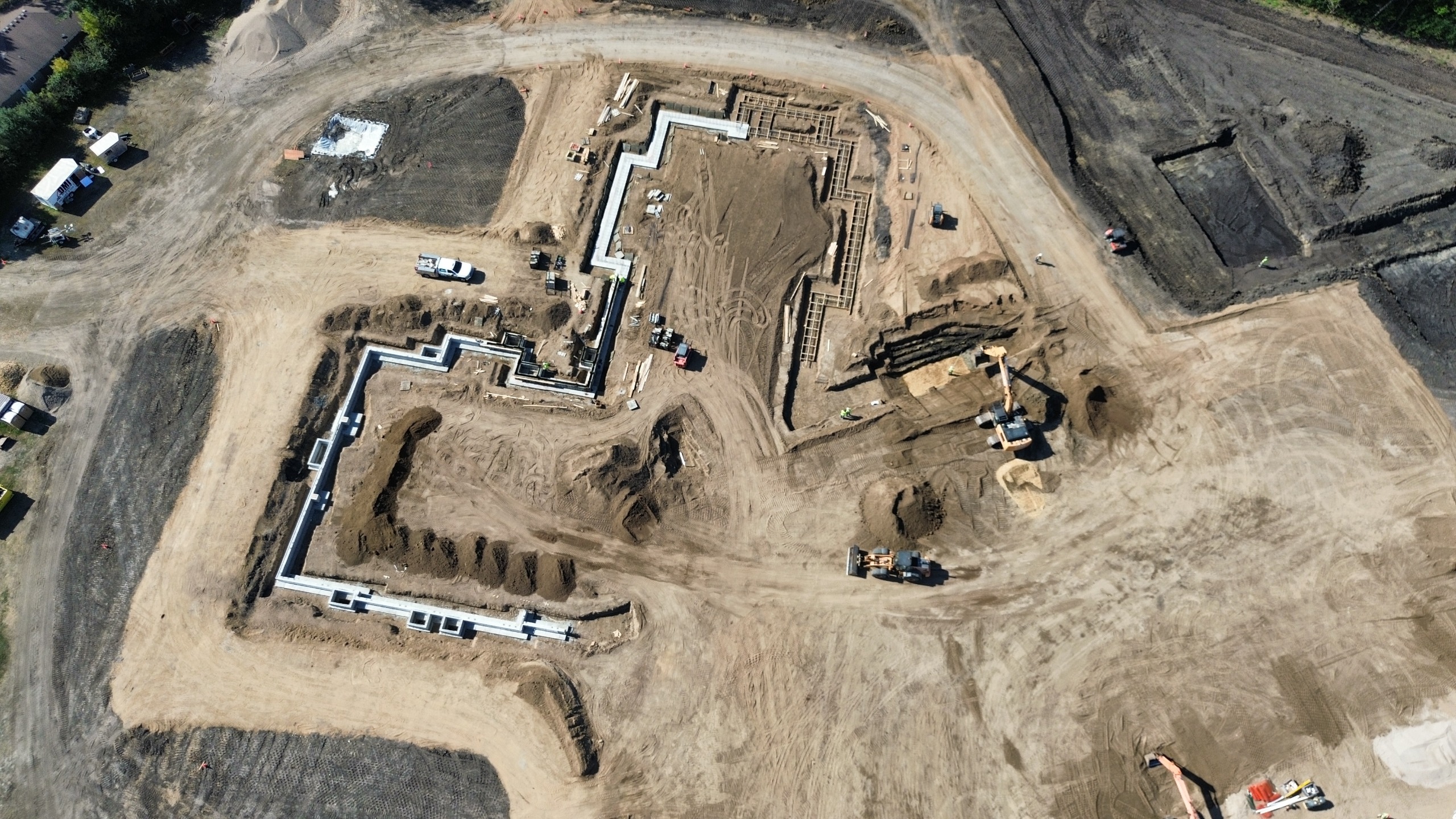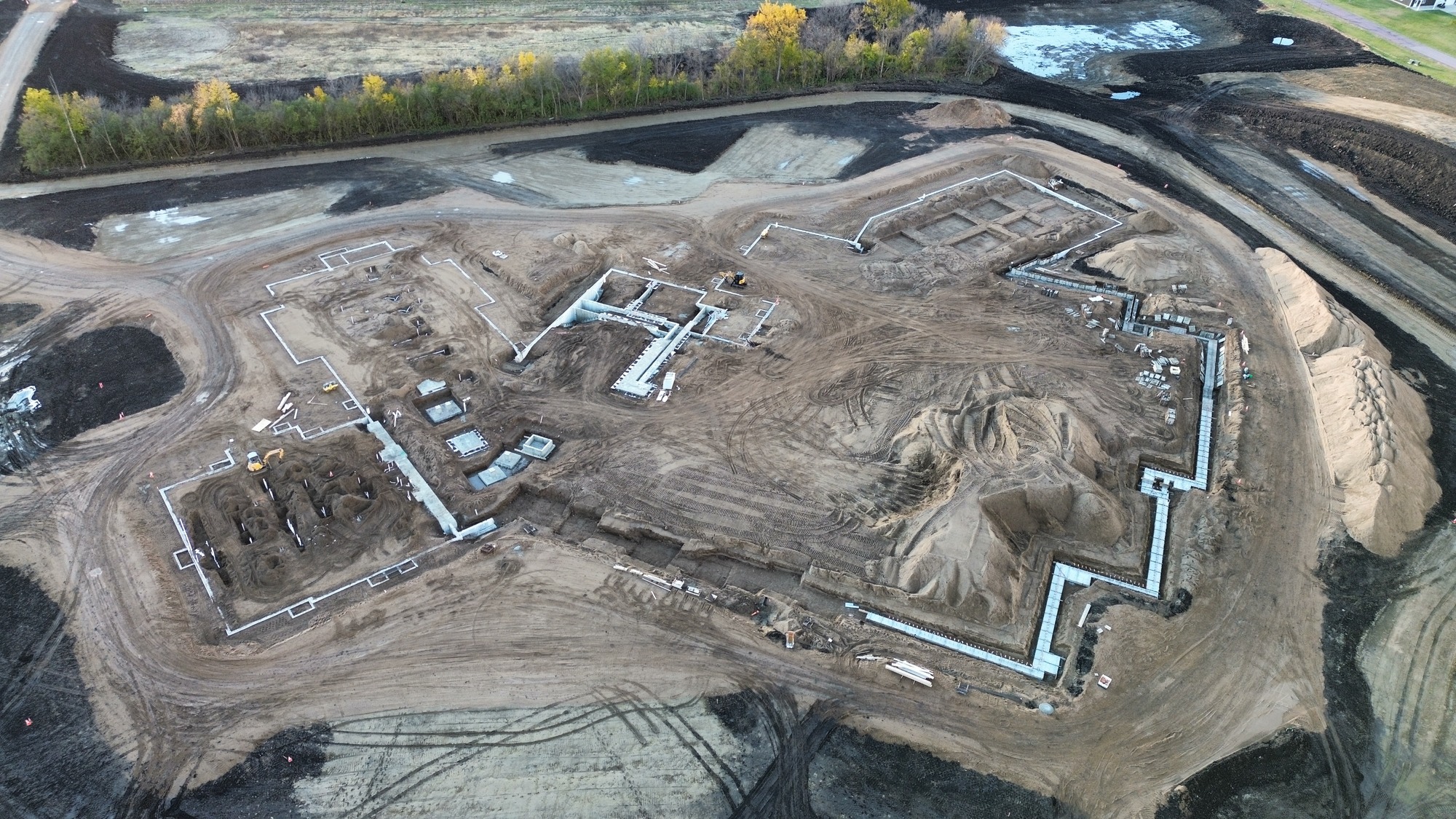 Site preparation is complete with mass grading finished and the pond fully dug. Crews have started installing underfloor plumbing and underslab electrical in select areas, laying the groundwork for upcoming phases. Footings and foundations are nearly complete, paving the way for the next milestone. Precast wall panels will soon be set up on site, giving the structure its first visible form.