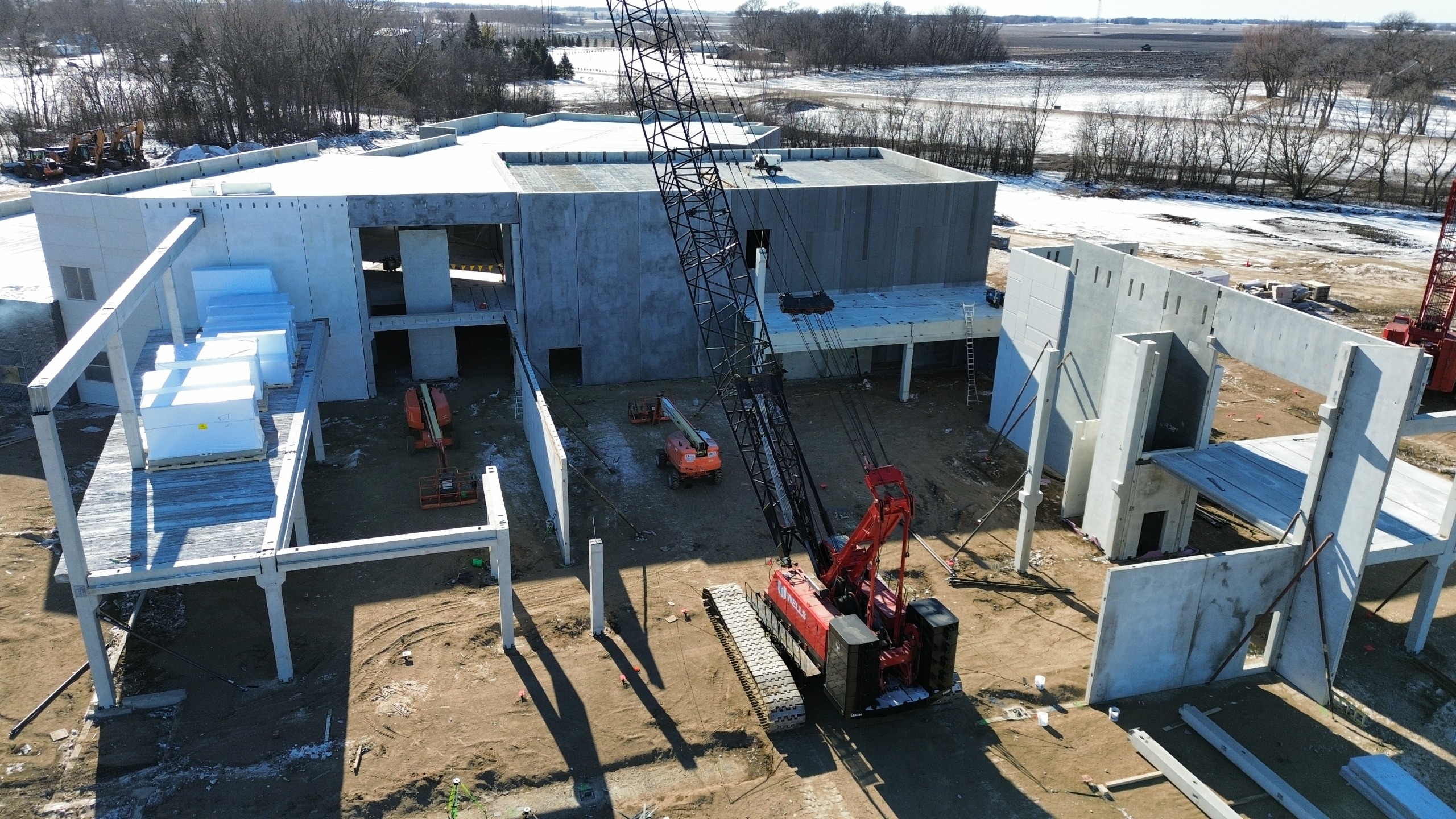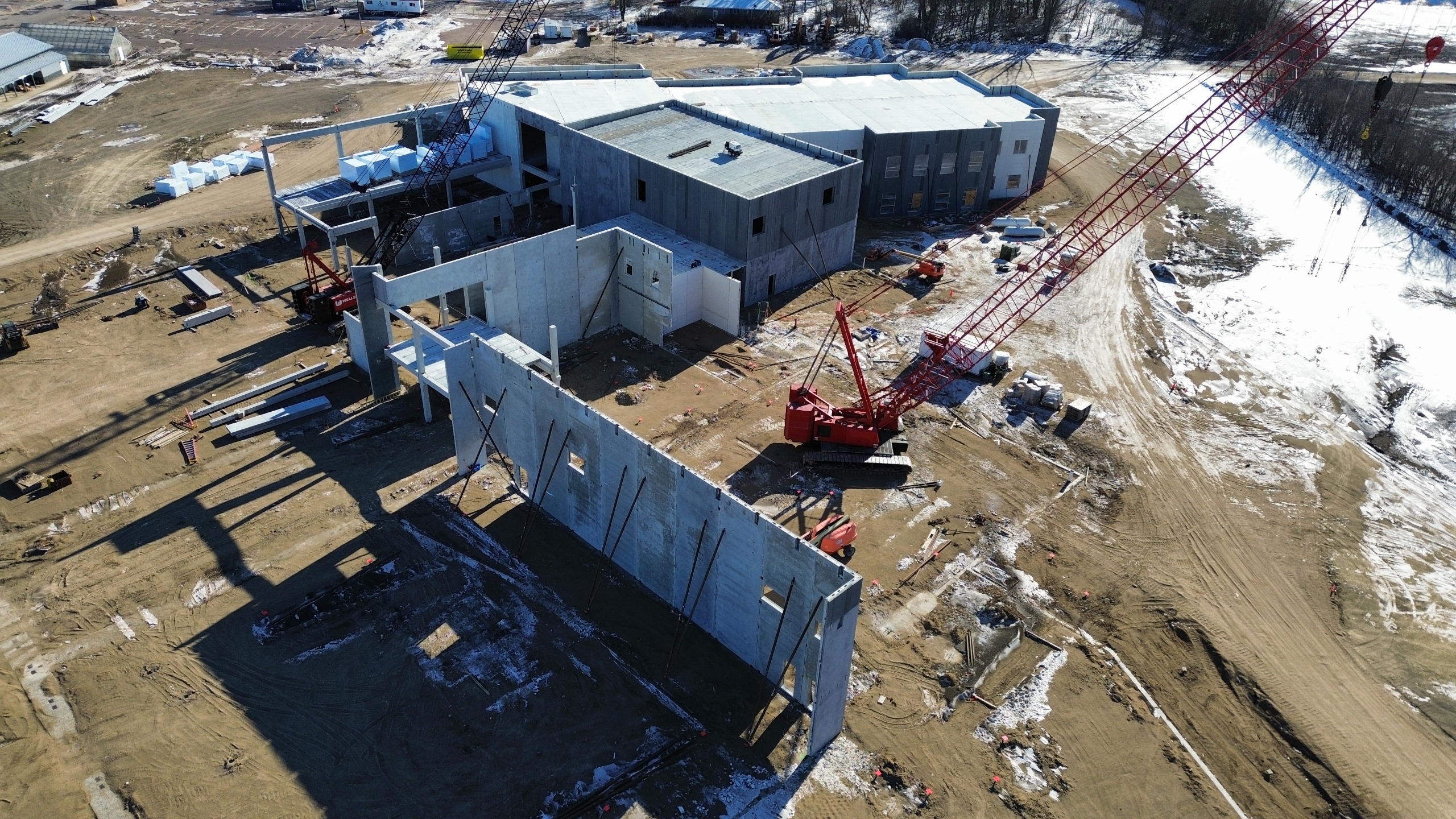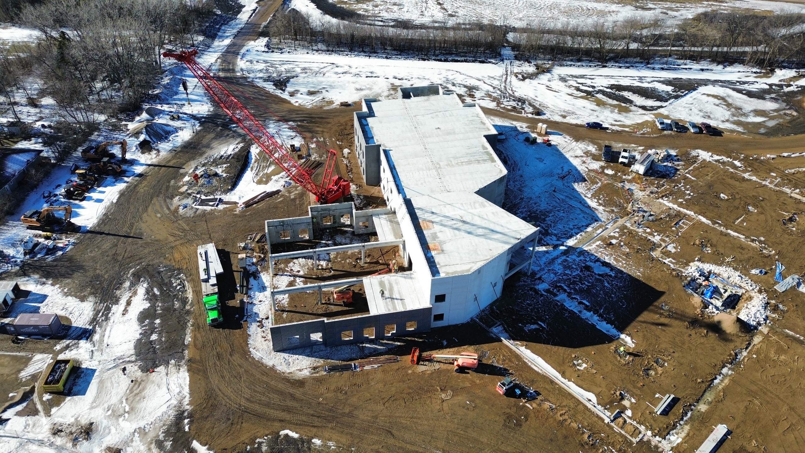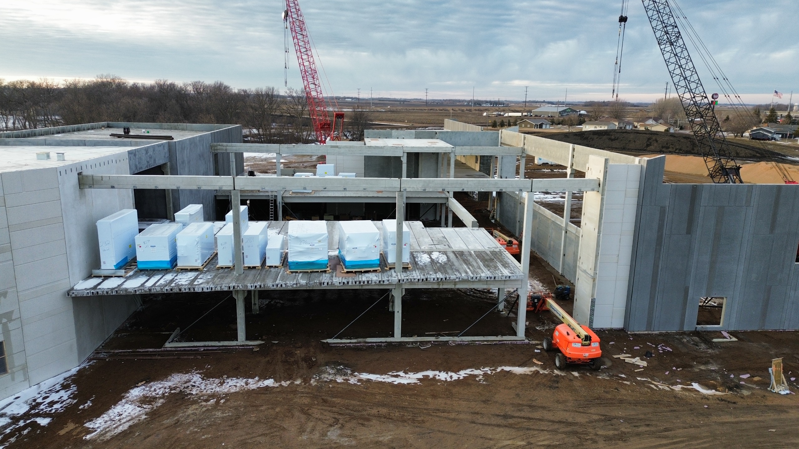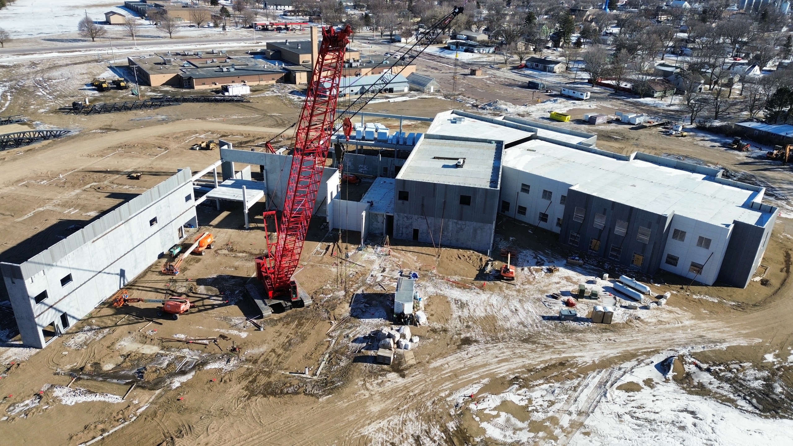 The crane is setting panels in Area E which will be the CTE shop spaces