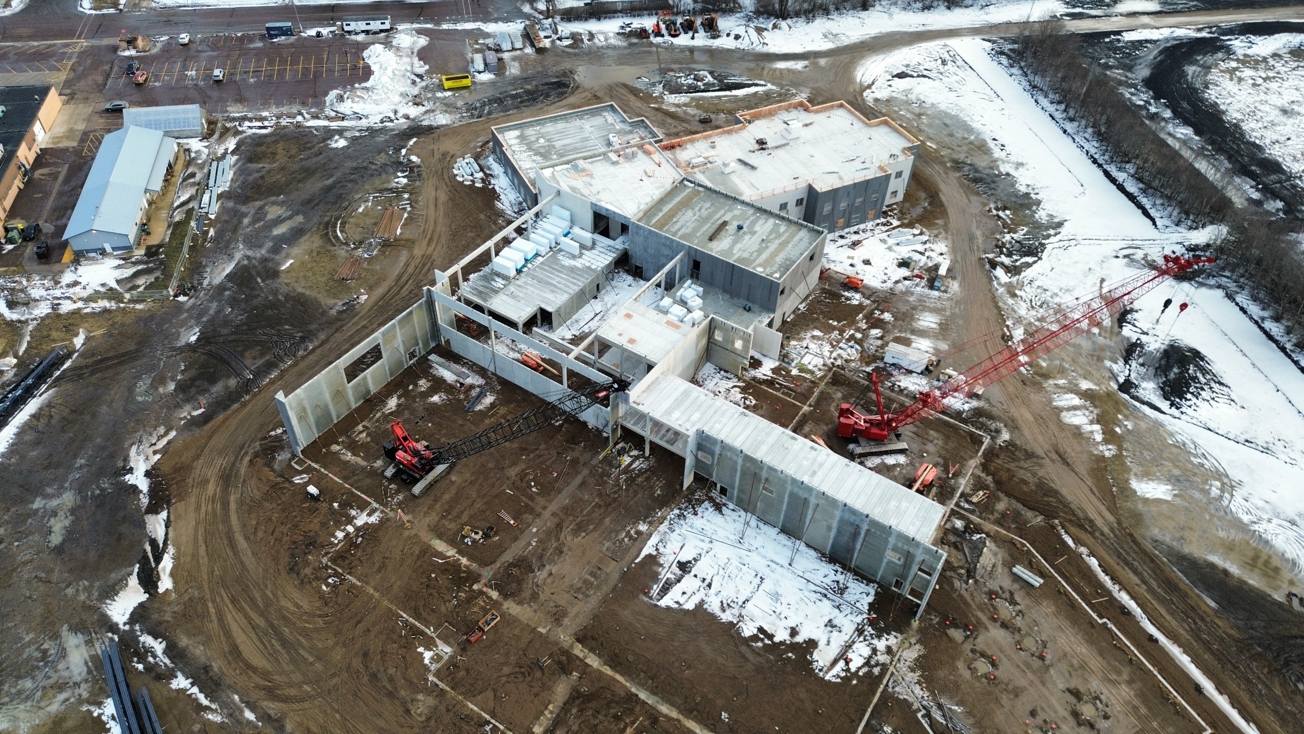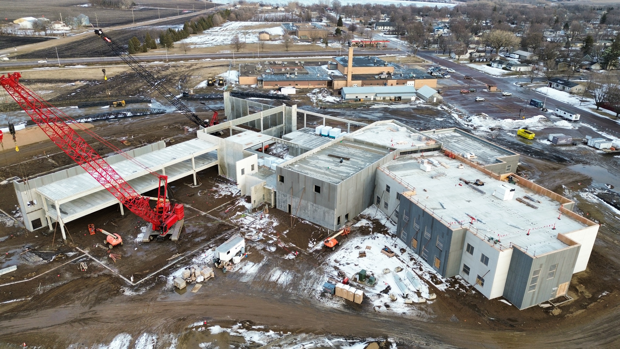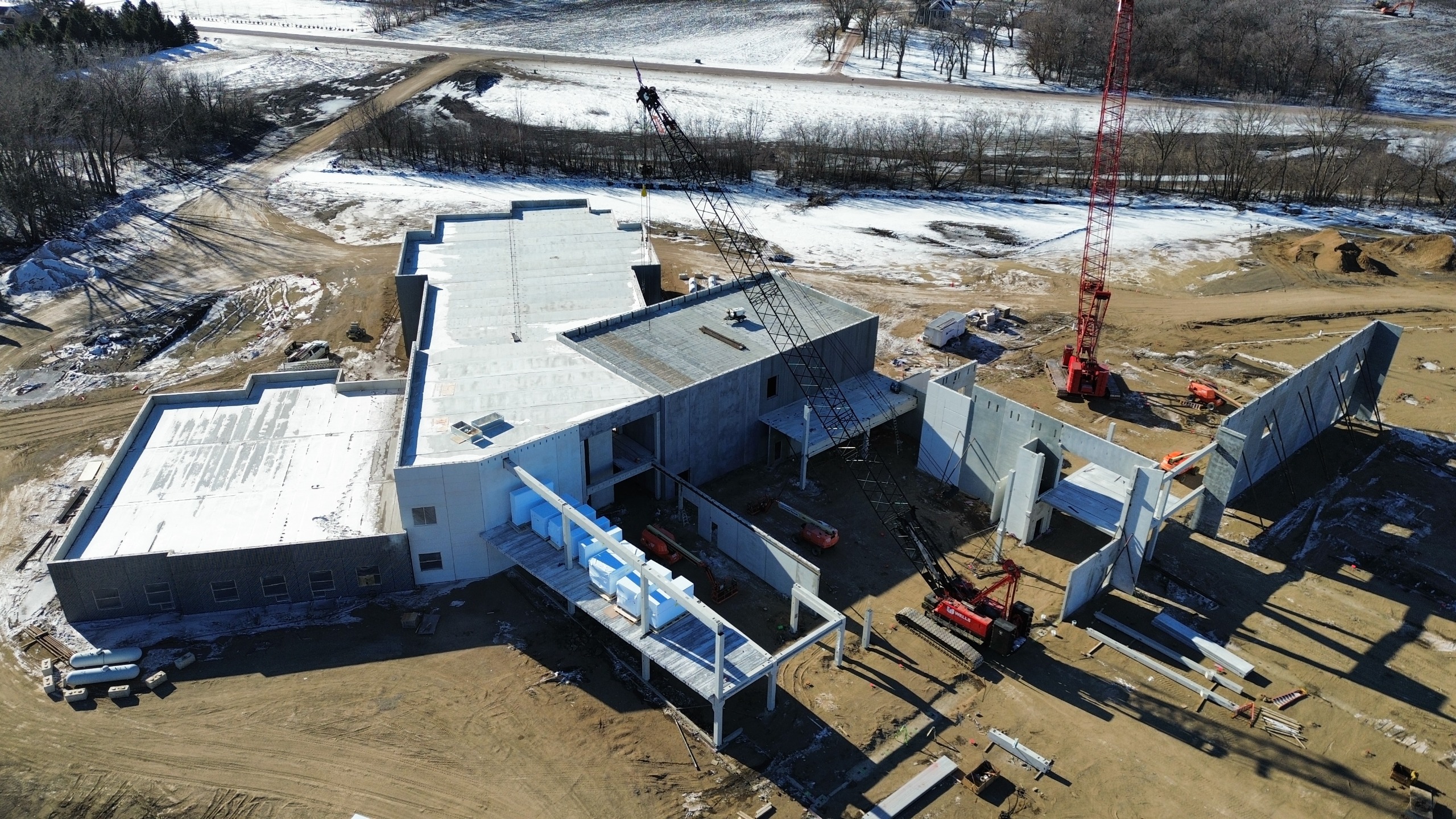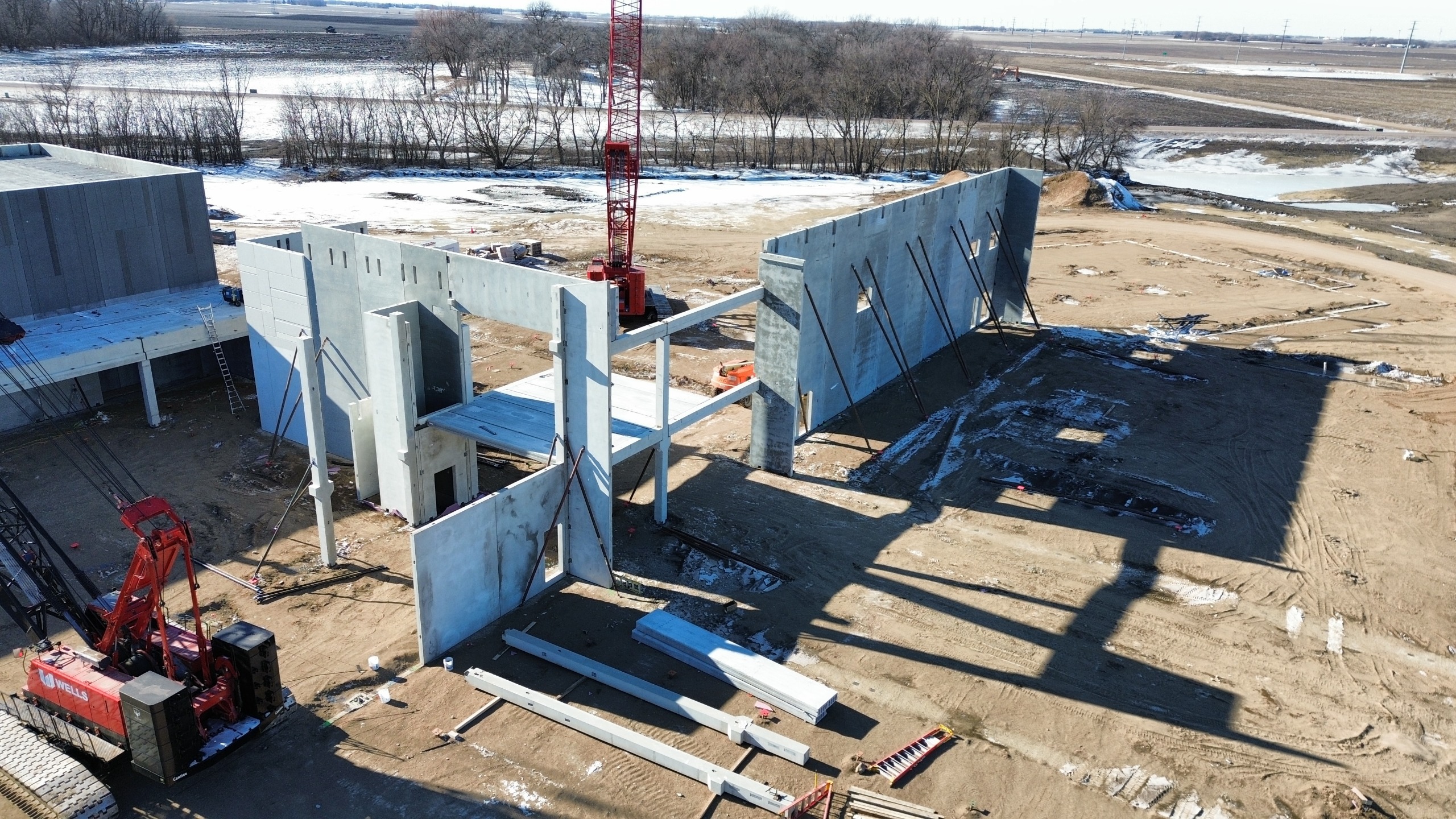 The crane is setting panels in Area E which will be the CTE shop spaces