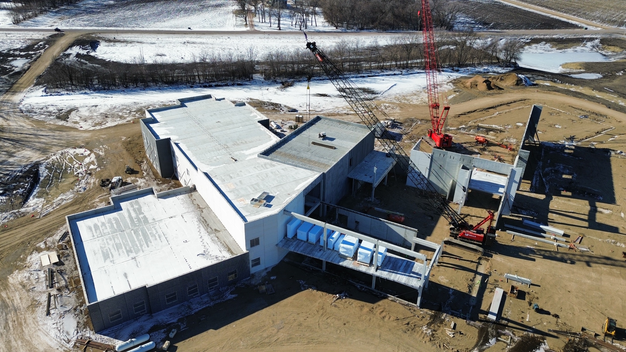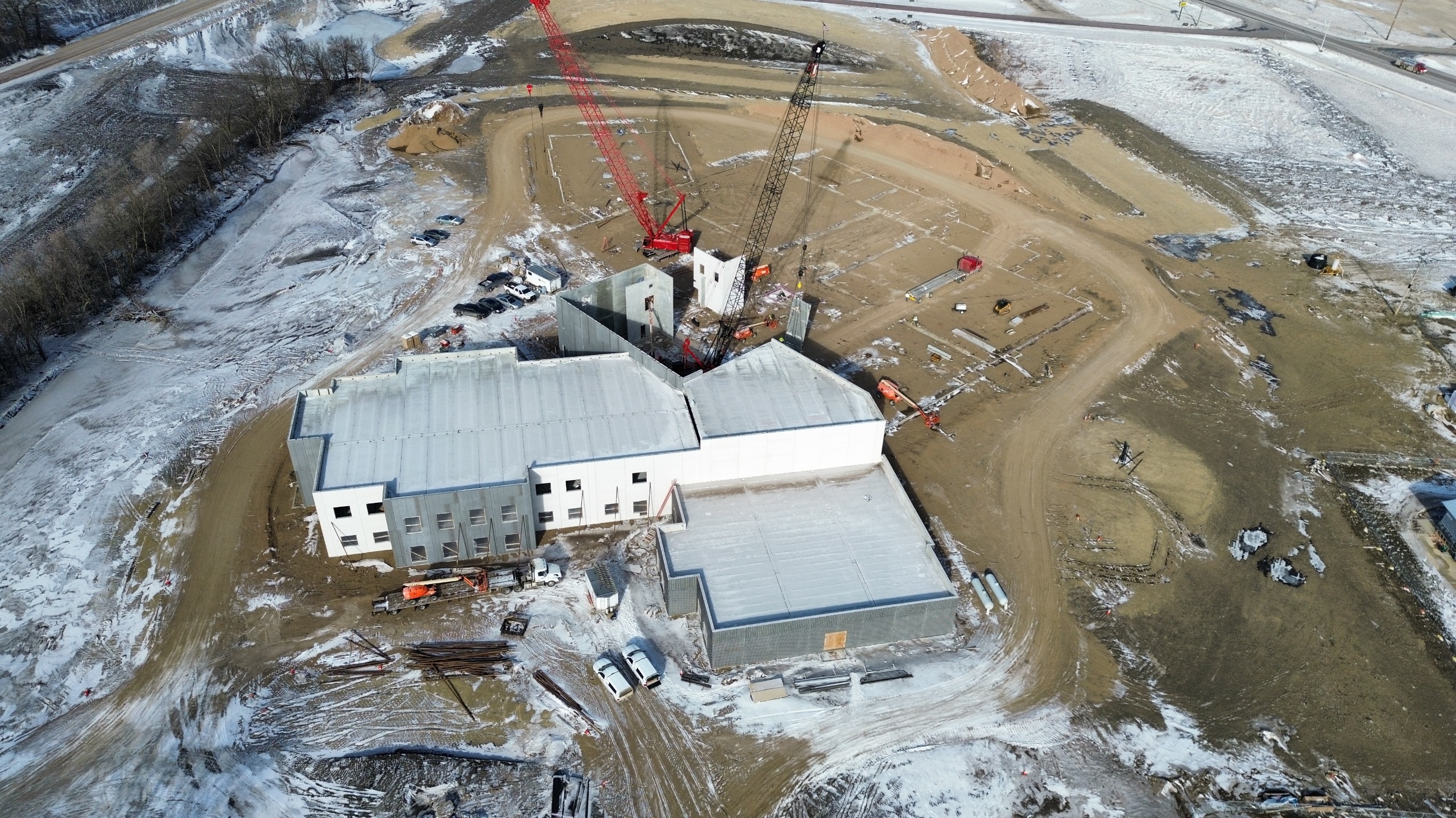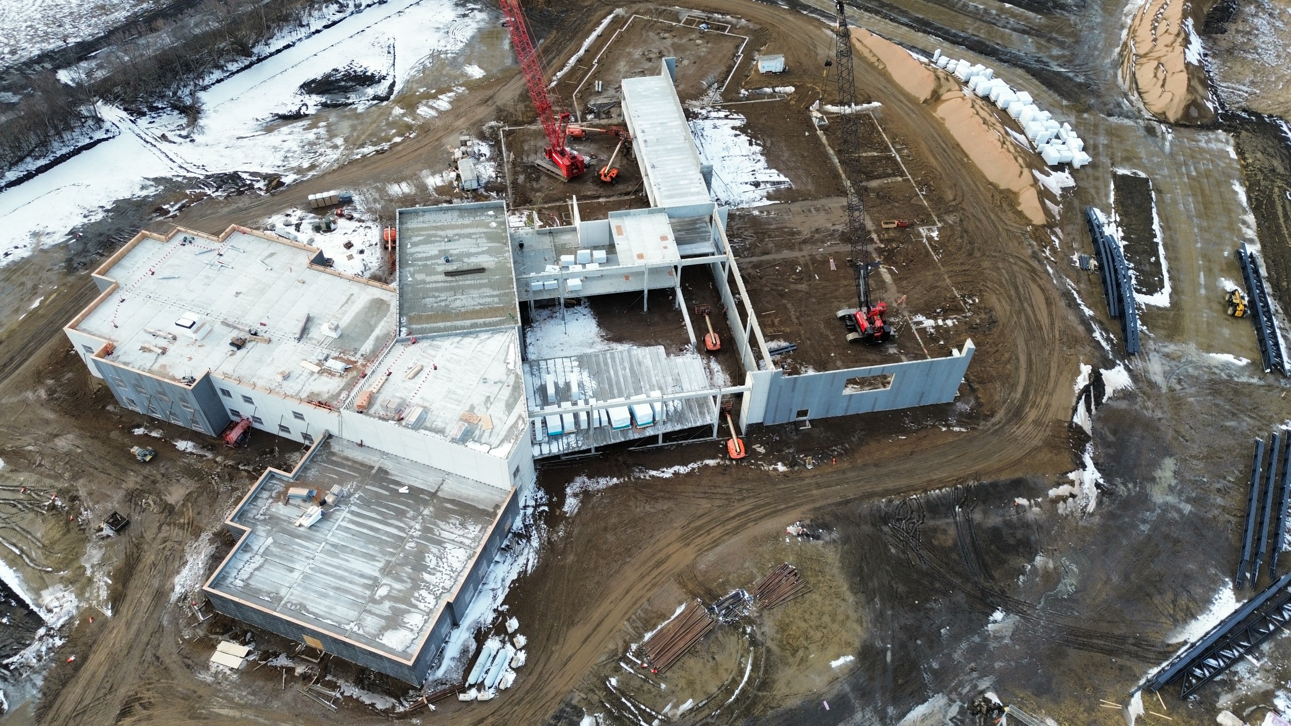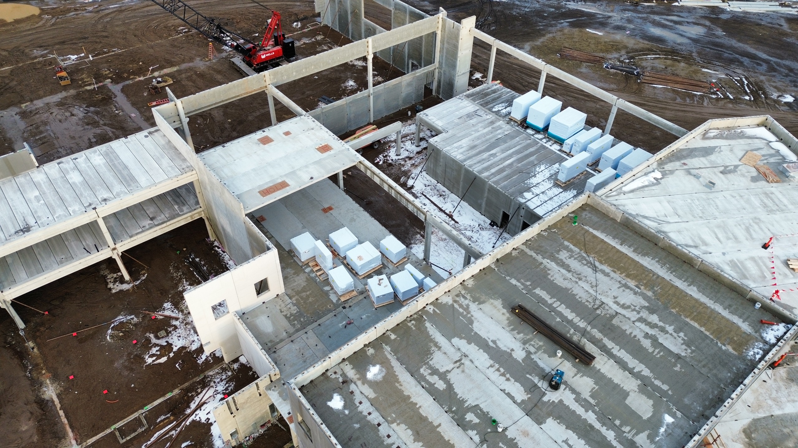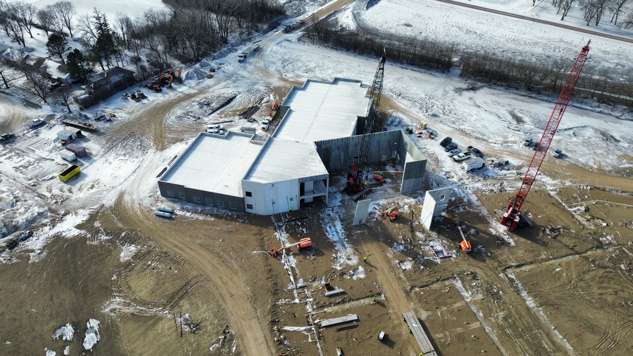 The crane is setting panels in Area E which will be the CTE shop spaces
